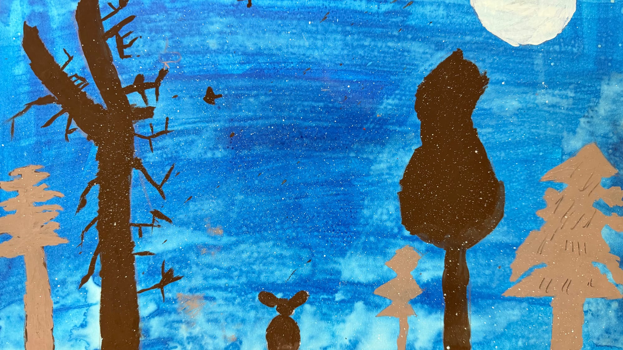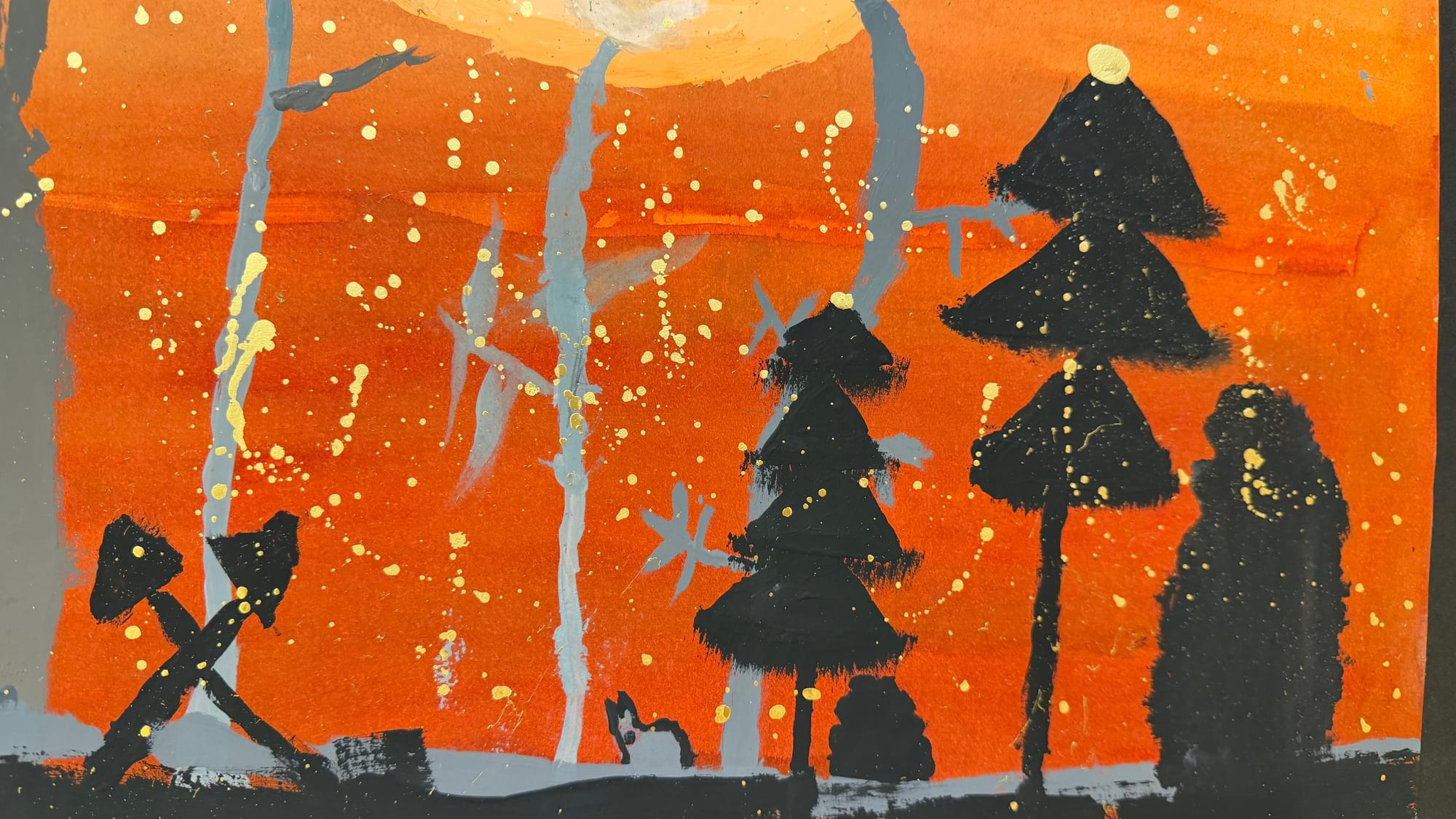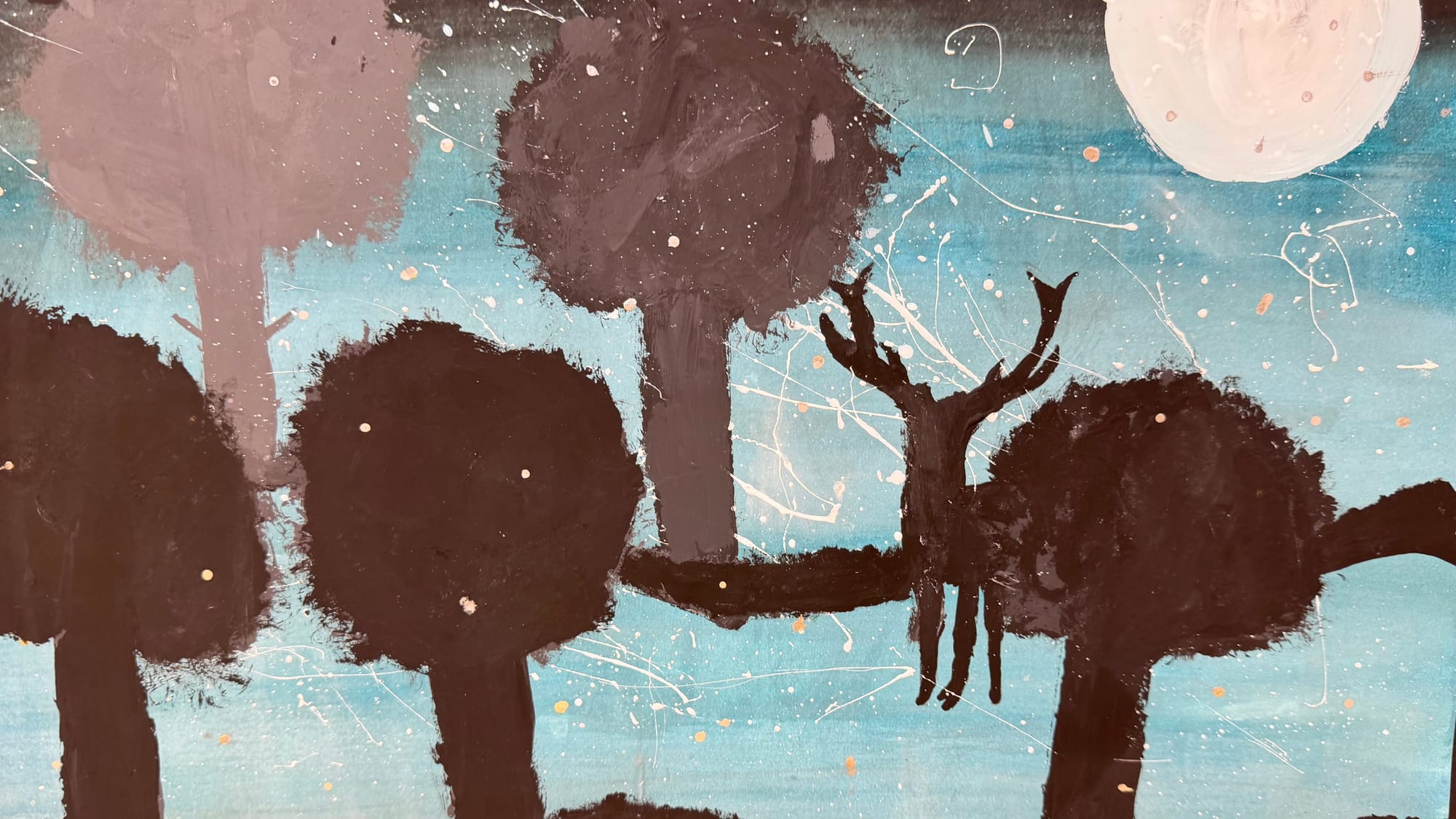 Technique : Encres pour le fond, gouache pour la forêt, les giclures et les silhouettes, éventuellement stylo. Accorder le scintillement avec le fond (= couleur chaude ou froide)