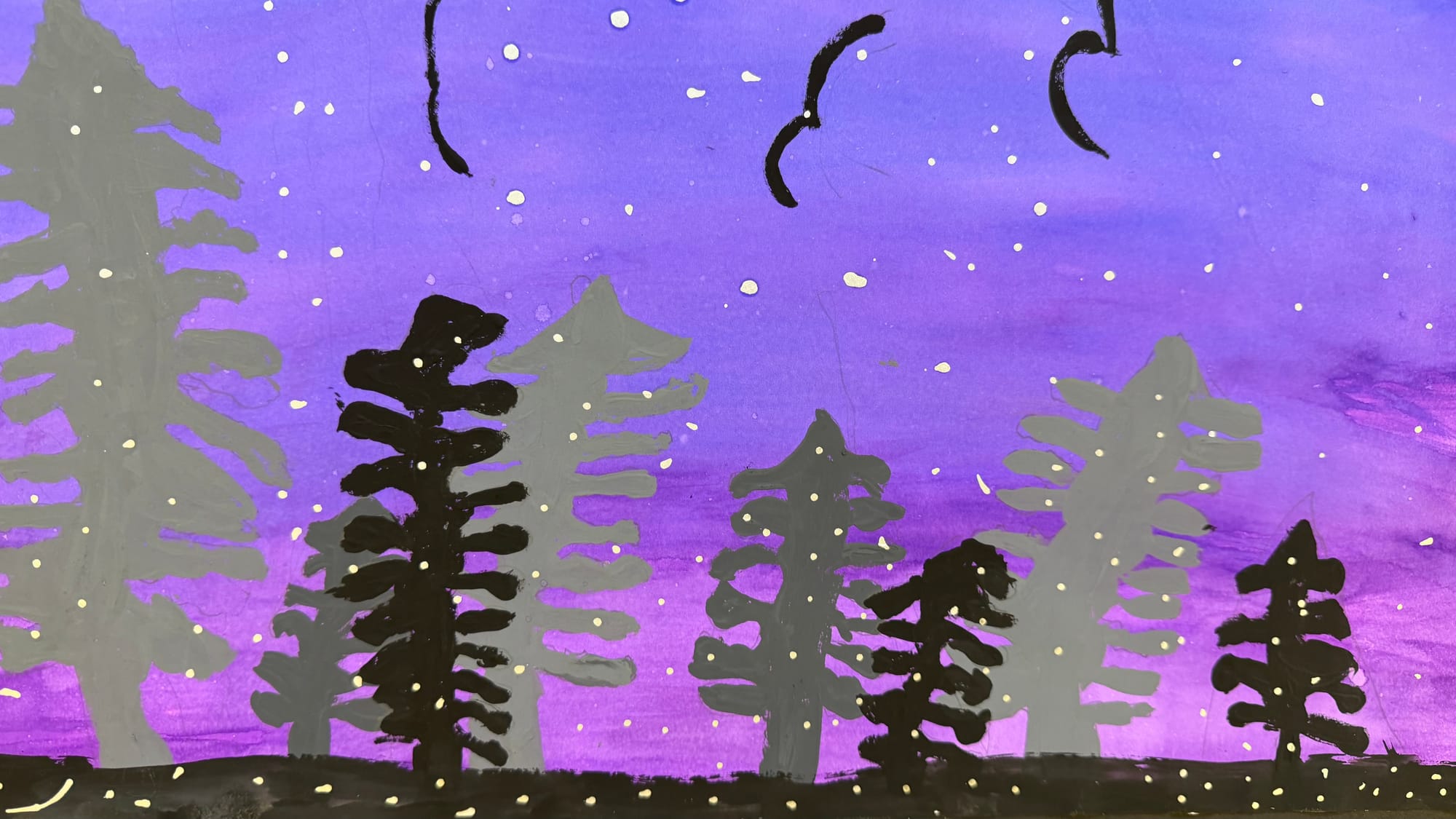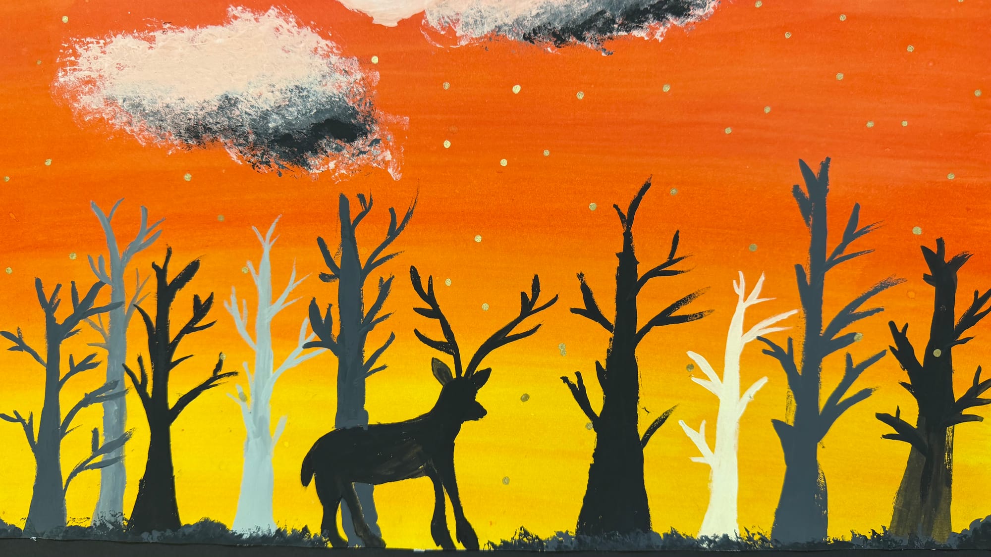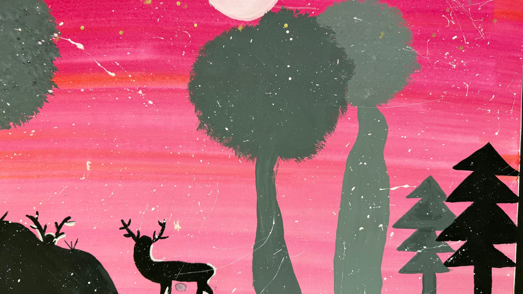 Technique : Encres pour le fond, gouache pour la forêt, les giclures et les silhouettes, éventuellement stylo. Accorder le scintillement avec le fond (= couleur chaude ou froide)